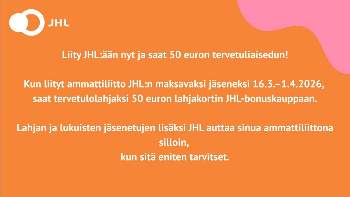 Kun liityt ammattiliitto JHL:n maksavaksi jäseneksi 16.3.–1.4.2026, saat tervetulolahjaksi 50 euron lahjakortin JHL-bonuskauppaan.